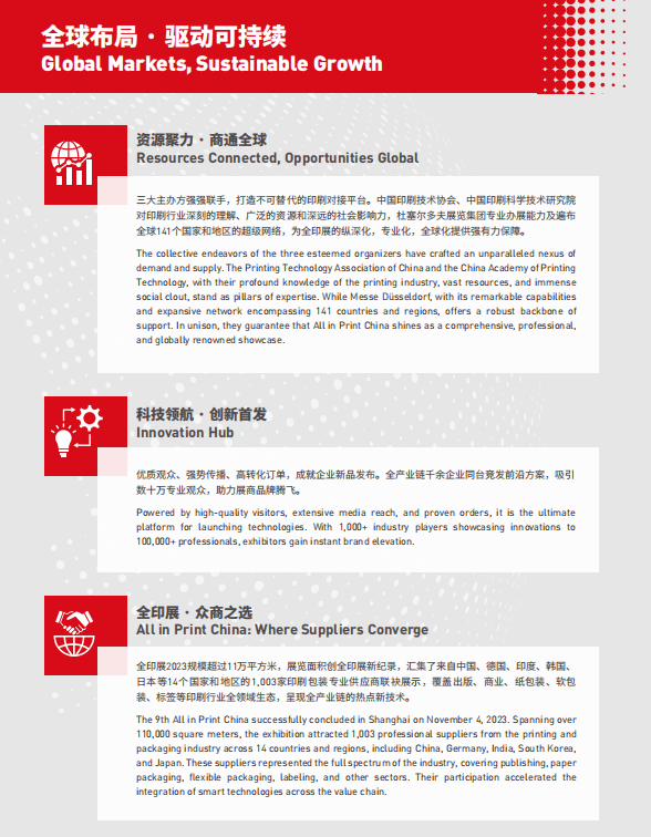 2026 年金秋十月,当梧桐叶开始染上第一抹金黄,全球印刷业的目光将如百川归海般齐聚上海新国际博览中心。由中国印刷技术协会、中国印刷科学技术研究院与杜塞尔多夫展览 (上海) 有限公司强强联袂打造的第十届中国国际全印展 (All in Print China 2026),将于 10 月 12 日至 16 日绽放璀璨光芒。这场以 智印未来,创印无限 为主题的行业盛会,宛若一座连接现在与未来的彩虹桥,预计将吸引逾十万专业观众共襄盛举。作为中国印刷界的奥林匹克,它不仅是一场技术的盛宴,更将成为驱动行业破茧成蝶、跨界融合的创新引擎。